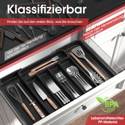 AUJEN Besteckkasten für Schubladen -Abnehmbar Besteckeinsatz für Schubladen, Praktischer Schubladeneinsatz, Erweiterbar Schubladen Organizer, Effiziente und Vielseitiger Küchen Organizer, Schwarz